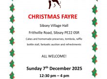 A polite reminder that The Fen Bank Christmas Fayre is booked for Sunday 7th December 2025 at Sibsey Village Hall. Everyone is welcome, along with their hounds and