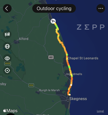 The round trip of 25 miles (Sutton on Sea to Skegness and back again along the coast path) was completed in just over 2 hours.