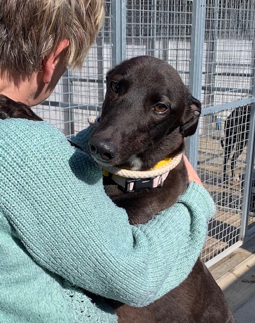 Flick (DOB 12/2/24) is very friendly, loves to play and greets everyone like a long lost friend. Since she retired from racing she has become a professional hugger, whether you asked for one or not. She can be a bit excitable but if you’re looking for a fun affectionate friend, Flick’s your girl.